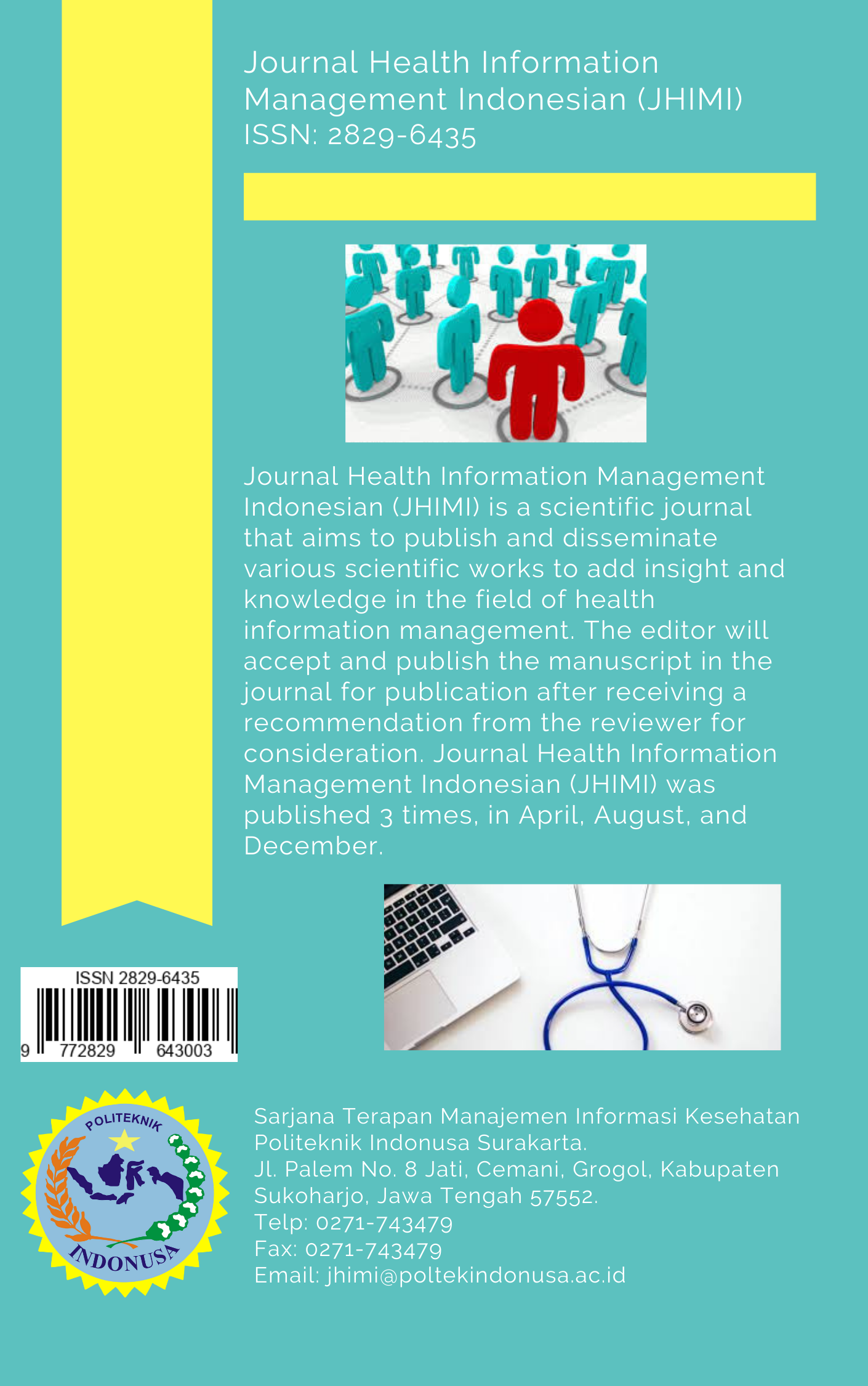 Journal Health Information Management Indonesian (JHIMI) merupakan jurnal ilmiah yang bertujuan untuk mempublikasikan dan menyebarluaskan berbagai karya ilmiah untuk menambah wawasan dan ilmu pengetahuan di bidang manajemen informasi kesehatan. Bidang Manajemen Informasi Kesehatan yang dimaksud terdiri dari scope keperawatan, kesehatan masyarakat, farmasi, Teknologi Laboratorium Medis, perekam dan informasi kesehatan, kebidanan, analis kesehatan, nutrisi, psikologi, dan ilmu kesehatan lainnya. Fokus artikel yang diterbitkan adalah artikel penelitian dengan referensi minimal 5 tahun terakhir publikasi. Redaksi menerima naskah publikasi penelitian dan akan melakukan penyaringan berdasarkan relevansi ilmiah. Naskah yang diterima adalah artikel asli dan diharapkan dilengkapi dengan halaman validasi. Editor akan menerima dan menerbitkan naskah dalam jurnal untuk diterbitkan setelah mendapat rekomendasi dari reviewer untuk dipertimbangkan. Journal Health Information Management Indonesian (JHIMI) terbit 3 kali yaitu pada bulan April, Agustus, dan Desember.